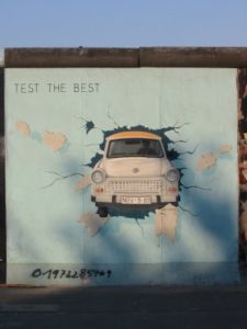 Die meisten Originalteile findet ihr in den USA. Kein Wunder! Für die Amerikaner bedeutete das Verschwinden der Mauer, dass damit auch das kommunistische System überwunden wurde. Der Gedanke der Freiheit ist in keiner Nation der Welt so lebendig wie in Amerika. Wie steht es mit dem ehemaligen Ostblock? In Russland findet sich nur ein Mauerteil, es steht im Moskauer Andrej-Sacharow-Zentrum und ist dem berühmten Dissidenten und Friedensnobelpreisträger gewidmet. Mauerteile stehen noch in Südkorea, bei den Vereinten Nationen in New York, in Südafrika – Nelson Mandela hat ein Stück zum Geburtstag bekommen – und auf vielen anderen Orten der Welt. Dieses Bild rechts zeigt das berühmte Trabbi-Motiv, es findet sich auf der East-Side Gallery in Berlin Mitte.
